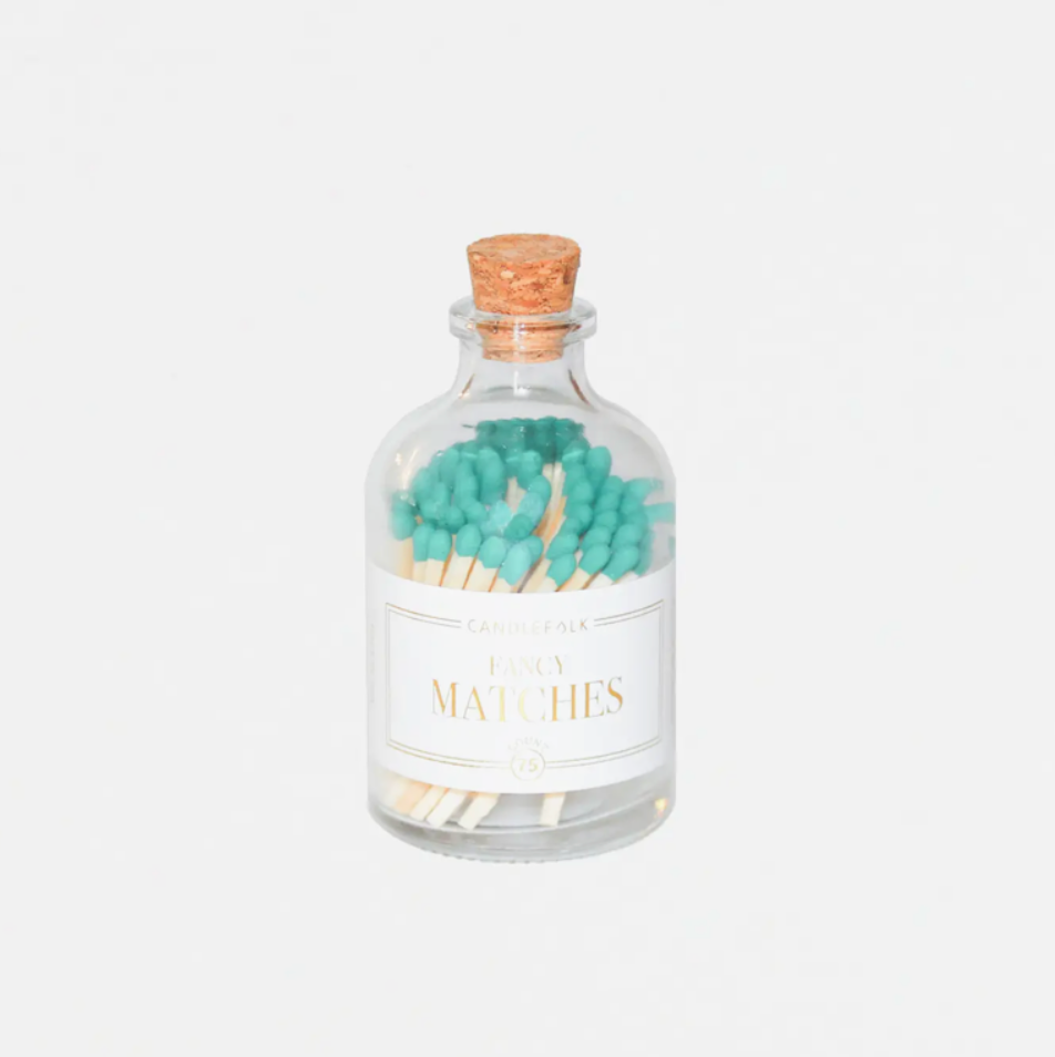 Colored tip matches in an apothecary-inspired glass bottle with a cork top and a striker on the bottom. Approximately 75 matches included.